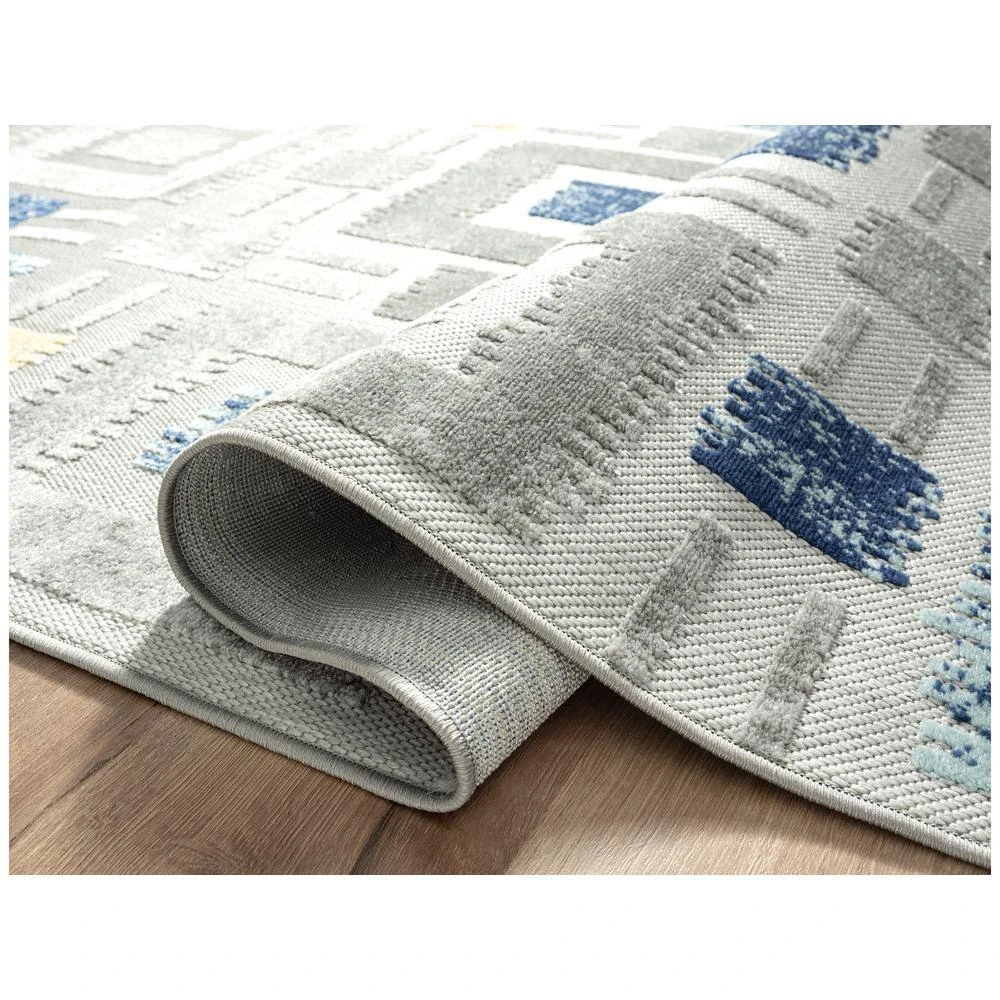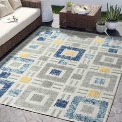 In the past century, color and shapes took center stage as the leading medium for storytelling. Found in the top art of the time, this simplicity is reflected in every aspect of contemporary design. This area rug utilizes square shapes and linear designs to create a feeling of ease and comfort. The shades of grey and blue offer a cooling effect, while the pops of yellow reveal an unexpected twist. Effortlessly modern and undeniably eye-catching, this durable area rug is a favorite for a reason.