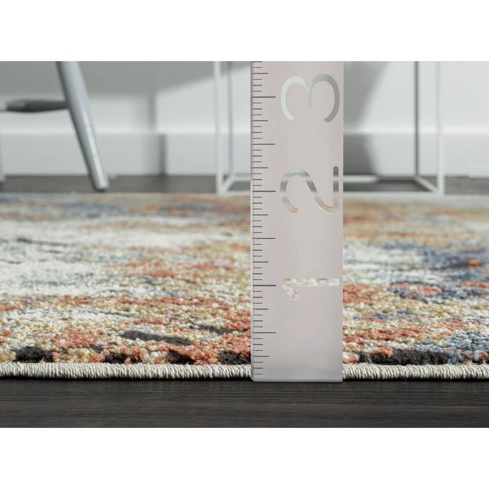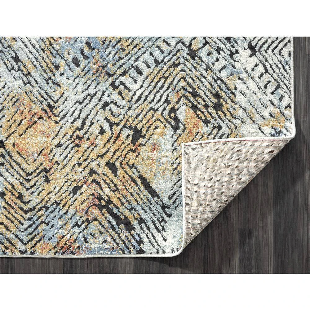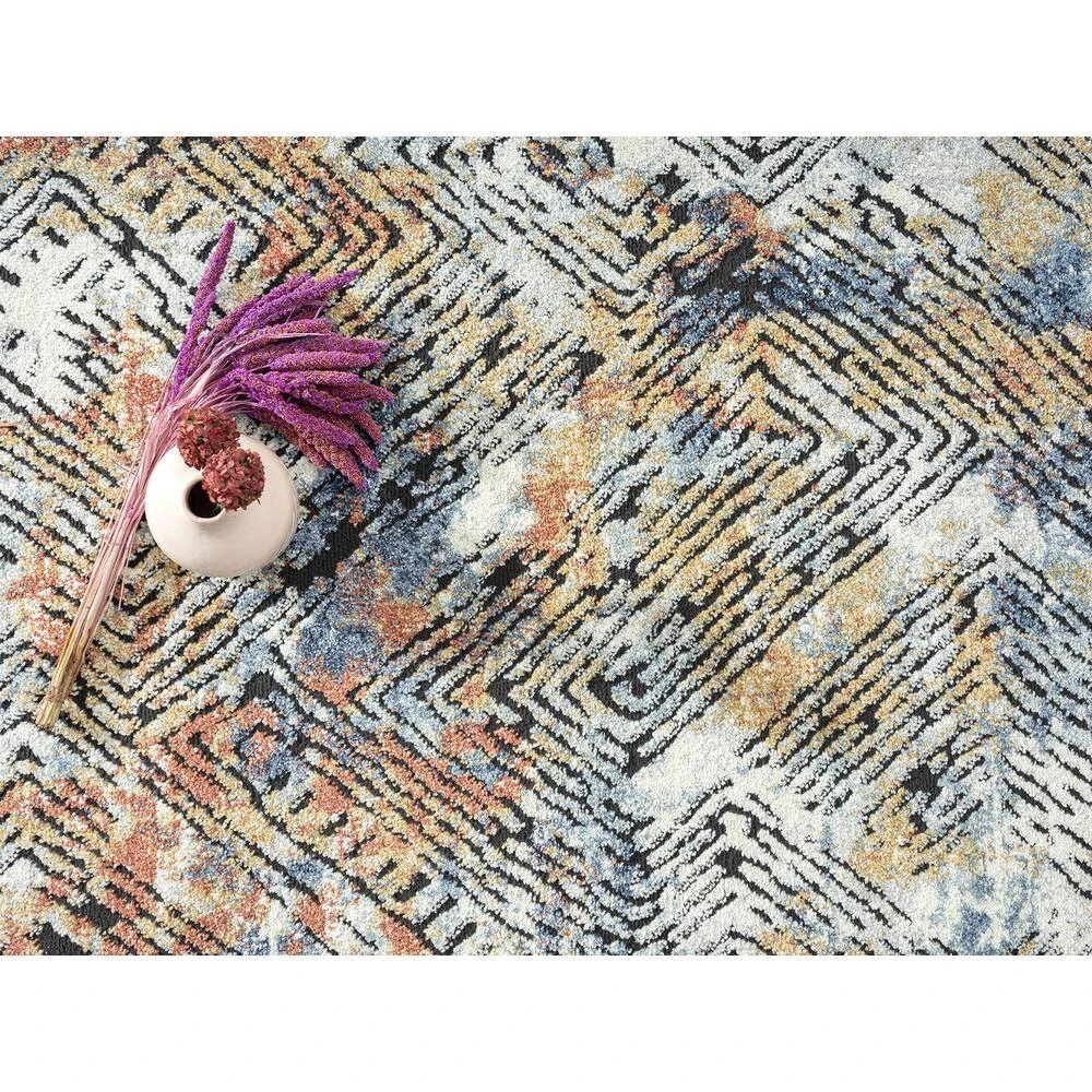 This rug design features a linear etched design in various directions creating an appealing abstract design. Elevate your space with the style and multicolor hues of this area rug. Bring in various decor elements with the greige, blue, red, orange rust found in this rug. The texture of the weave creates a soft rug to adorn your living room, bedroom, dining room or any other space.